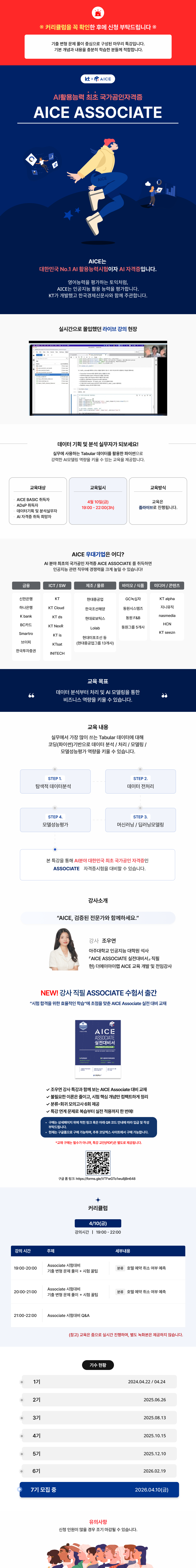 또한 금융 AI, LLM 평가 등 최신 AI 트렌드 연구를 병행하며, AICE 자격증 취득을 넘어 실무 역량까지 확장할 수 있는 강의를 제공합니다.