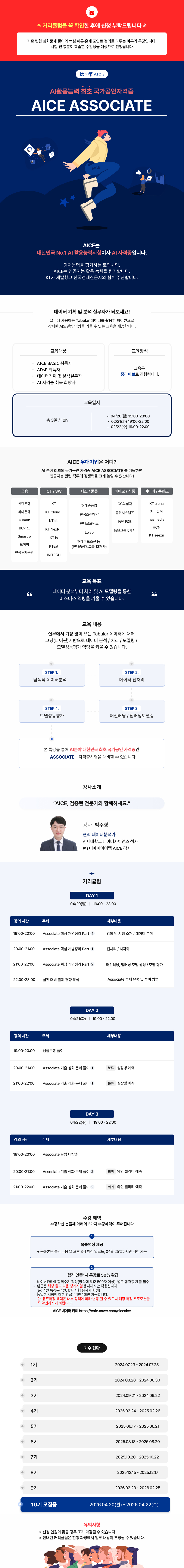 IT 기업에서 데이터 분석과 AI 프로젝트 경험을 바탕으로 실무형 인재를 양성하고 있으며, 현재 AICE 공인강사로서 Associate, Basic 강의를 통해 학생들의 AI 자격증 취득과 실무 역량 성장을 지원하고 있습니다.